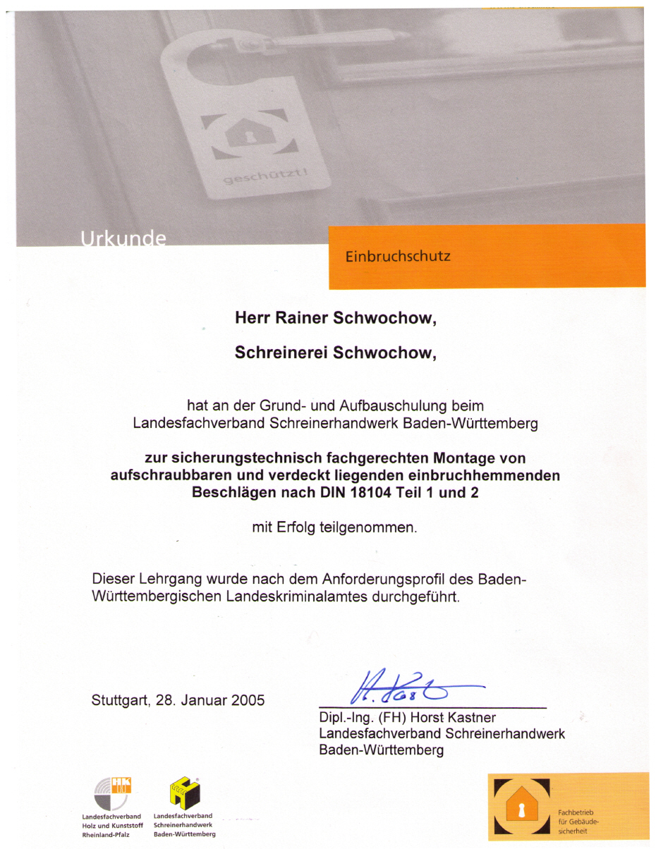 Wir sind zertifizierter Fachbetrieb für Gebäudesicherheit und eingetragen in der Errichterliste für Mechanischen Einbruchsschutz bei der Kriminalpolizei. Von der mechanischen Grundsicherung an Türen und Fenstern bis hin zu modernen Sicherungssystemen haben wir die sichere Lösung für Sie und Ihre 4 Wände. Gerne beraten wir Sie bei Ihnen zu Hause oder nutzen Sie die neutrale Beratung der Kriminalpolizeilichen Beratungsstelle. |